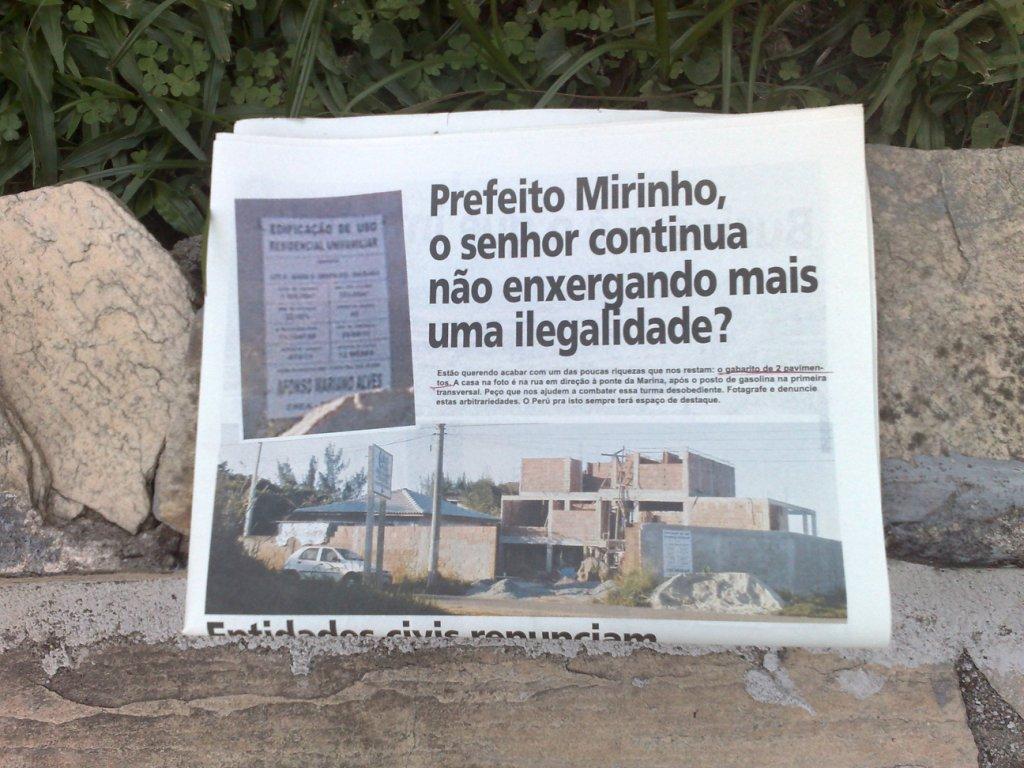 Na semana passada o Jornal O Perú Molhado denunciou uma construção irregular (com 3 pavimentos) na Marina. A casa da foto acima está situada na Avenida dos Tangarás-, na primeira transversal logo após o posto da Marina, sentido ponte.