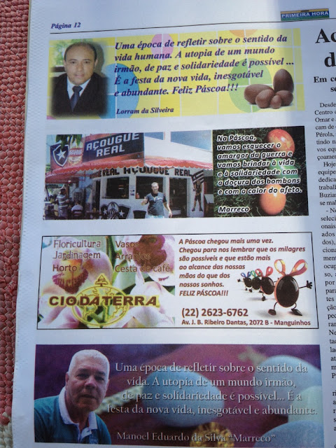 Nessas datas comemorativas, como natal, dia das mães, páscoa, etc, é comum vermos publicadas nos jornais mensagens bregas de políticos de nossa cidade. Em geral, são de muito mau gosto. Mas, agora, temos a breguice duplicada. Reparem que o texto do Lorram é o mesmo do Marreco! Ridículo! (ver JPH, 6/4/2012, página 12).
