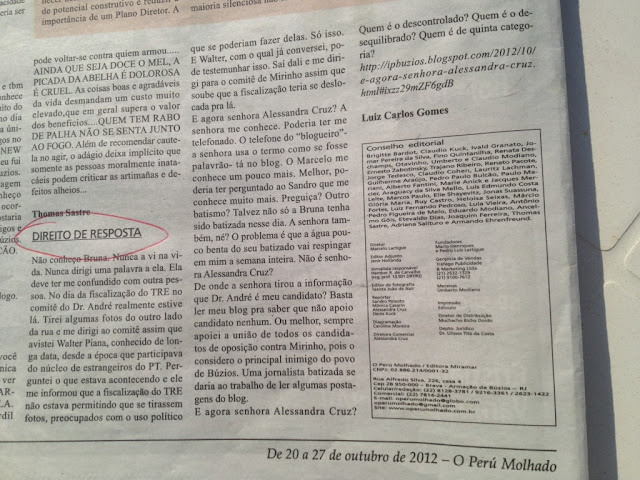 "Senhor Luiz Carlos. Boa tarde. Gostaria imensamente que sempre que o senhor for noticiar alguma coisa sobre minha pessoa, que por favor, me ligue ou me pase um e-mail. Algo parecido como o que o senhor cobrou outro dia de alguém. Engraçado o senhor: se chateia quando é citado ou acusado sem ser ouvido, mas não titubeia em agir da mesma maneira com os outros. lamento informar mas suas fontes estão loucas ou andaram bebendo. Ou talvez não existam... Eu jamais irei para outro jornal de Búzios ou da Região. Jamais aventei isso. Para o colo governo - lugar dos sonhos de muitos- idem. Decido sair do Perú Molhado para mudar um pouco de vida. A decisão de sair do jornal sempre foi inimaginável para muita gente mediocre que acredita que sem o Perú eu morrerei de fome. Portanto gastaria que o senhor deixasse bem claro em seu blog que não, eu não vou trabalhar no jornal Primeira Hora". (comentário feito em