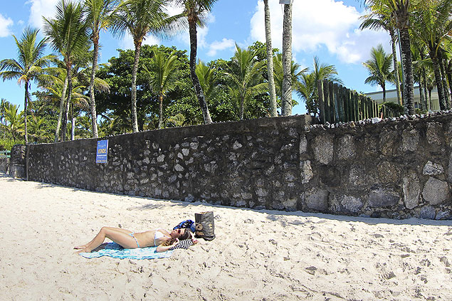 | Banhista em frente à mansão que pode perder terreno na praia de Pernambuco, em Guarujá |