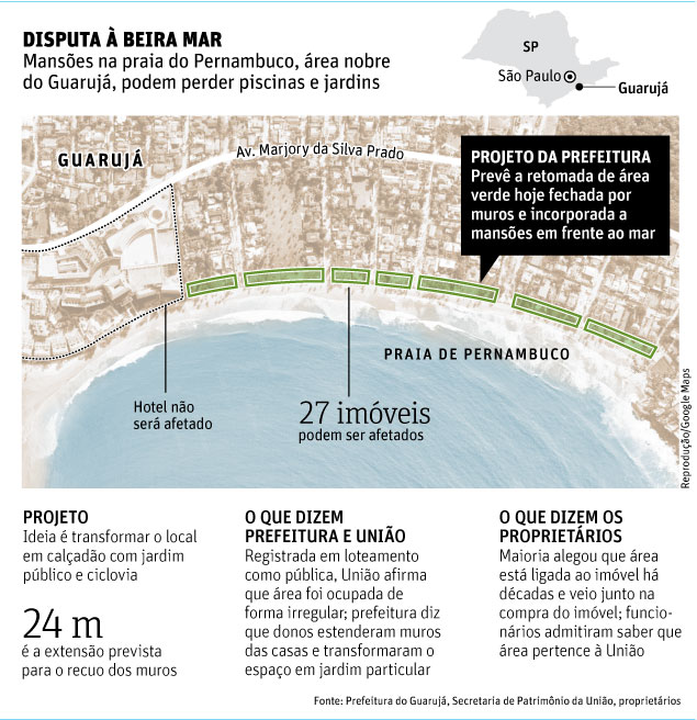 "Agora, a prefeitura de Guarujá quer retirar os muros das mansões, recuperar a área em volta e transformá-la em um calçadão com jardim público, ciclovia e rampas de acessibilidade". A proposta da prefeitura tem o apoio da União. Ambos assinaram um TAC (termo de ajustamento de conduta) para efetuar mudanças na orla. A Secretaria de Patrimônio da União diz que esse acordo "não só prevê como determina a desocupação das áreas ocupadas irregularmente".