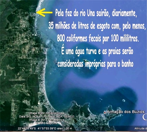 Aos 15 a 17 milhões de esgoto diluído somam-se outros tantos oriundos da ETE no Jardim Esperança. 30 a 35 milhões de esgoto diluído, com 800 ou mais coliformes fecais por 100 mililitros irão desaguar no oceano, na foz do rio Uno. É inevitável que desçam na direção de Búzios, e além, tornando as praias impróprias para o banho".
