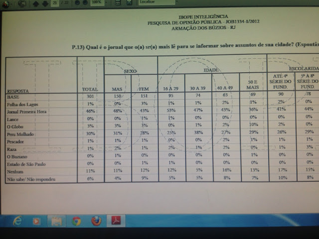 Analisando pesquisas eleitorais em Búzios encontrei, em uma pesquisa do IBOPE feita em 16/07/2012, informações sobre hábitos de leitura dos moradores de Búzios e o que os levam a escolher este ou aquele jornal. Vejam: