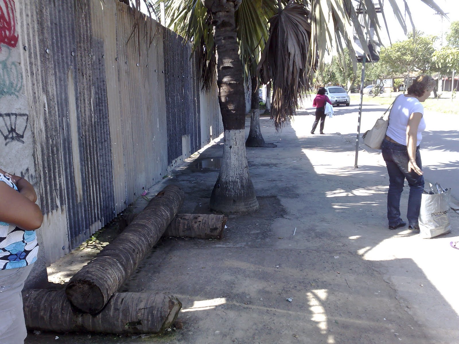 Isto é um ponto de ônibus. Fica bem pertinho da prefeitura, no Centro, ao lado do Posto Esso, onde o Executivo abastece seus carros. E quando chove, como é que fica? Isso ocorre em uma cidade que é destino internacional. Pode? O senhor prefeito não quer experimentar sentando no tronco?