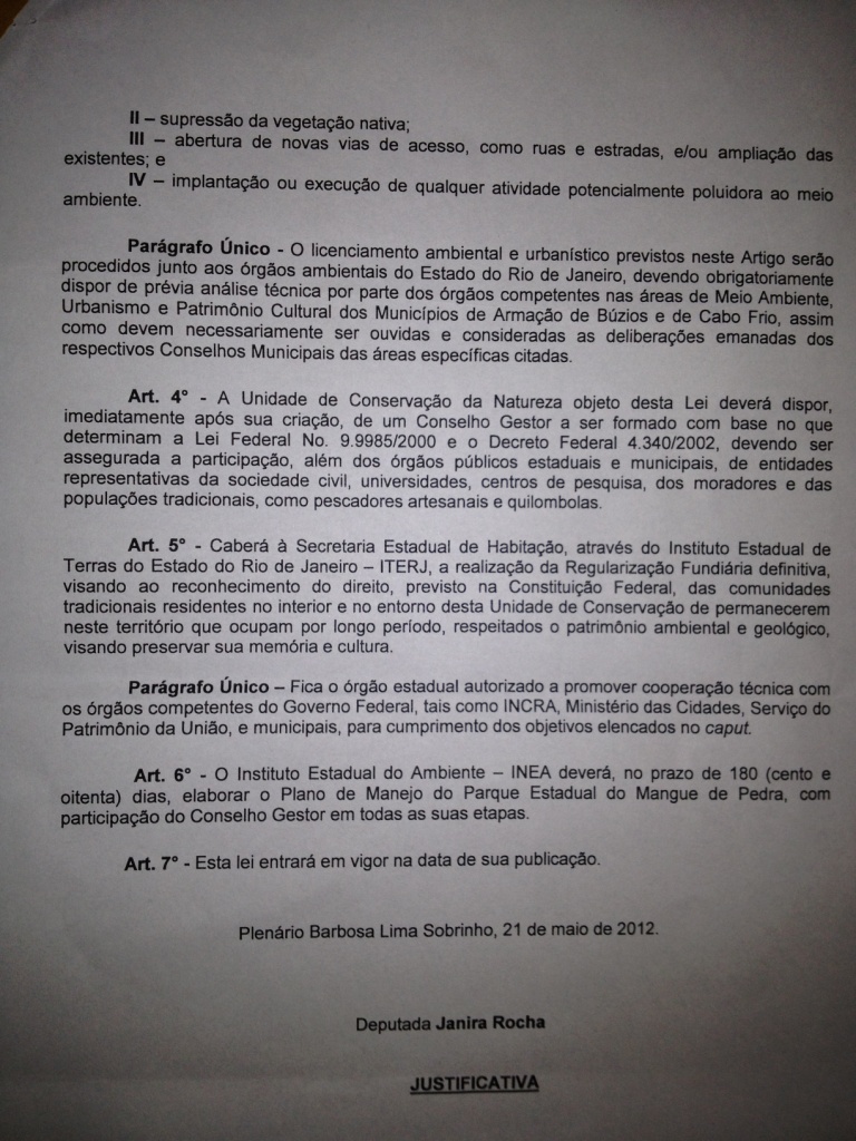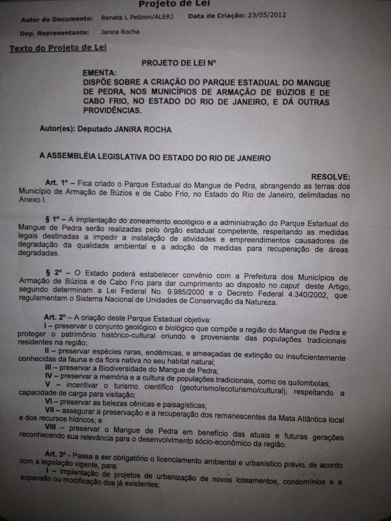 2- É autora com os deputados Wagner Montes e André Lazaroni, do PL 1625/2012 que cria o Parque Estadual do Mangue de Pedra, elaborado juntamente com os movimentos sociais e ecológicos de Búzios. Como parlamentar, tem lutado junto com os movimentos sociais de Búzios para proteger este raro ecossistema e os direitos das populações tradicionais que encontram-se ameaçados pela especulação imobiliária e a poluição. Preocupa-nos muito o fato do projeto de transposição de esgotos para o rio Una prever o lançamento destes efluentes próximo ao Mangue de Pedra, sem que tenha sido avaliado adequadamente o eventual impacto desta obra.