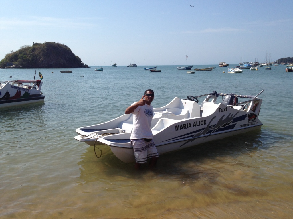 Nunca tinha andado de aqua táxi em Búzios. Como tinha deixado o carro perto da Praça Santos Dumont e andado com amigos que me visitavam pela Orla Bardot até a Azeda, resolvi voltar de táxi marítimo. Meus amigos ficaram encantados com a deslumbrante paisagem. O barco do Elivelton tem o piso acarpetado e ele é uma simpatia de pessoa. Portanto, quando vier a Búzios não deixe de usar este meio de transporte para conhecer as praias da cidade. O nome "Maria Alice" é uma homenagem à sua filha. Ele faz saídas das praias da Azeda, Centro, João Fernandes, Ossos e Tartaruga.