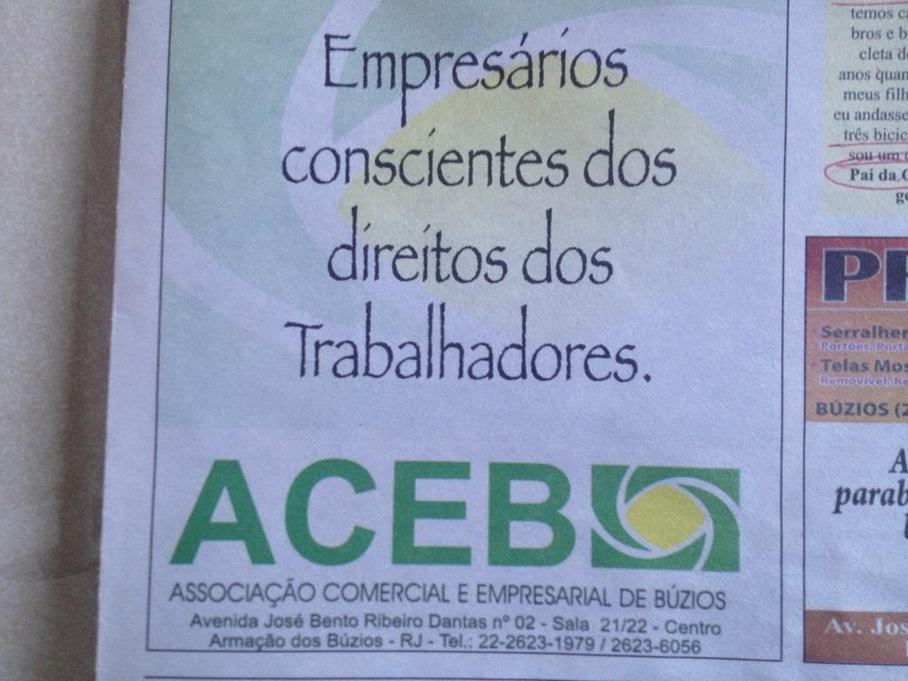 O último jornal O Perú Molhado, de 4 de maio de 2013, em sua página 9, trazia a publicidade da ACEB - Associação Comercial e Empresarial de Búzios, em alusão às comemorações já passadas do Dia do Trabalho. Será que os empresários e comerciantes de Búzios são mesmo "conscientes dos direitos dos trabalhadores buzianos"?