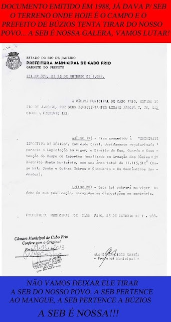 O campo da SEB já estava ali quando nasci. Um pouco mais pra lá, sentido Lagoa da Usina. Pra cá, antes do campo, tinha, na época, uma baixada, com um córrego, que inundava quando chovia muito. Aquela área e todo o seu entorno não era ainda loteada. Várias gerações de buzianos se utilizaram daquele espaço para soltar sua pipa, jogar bola de gude e futebol. A baixada era também ligação com o Poço da Bomba para as mulheres lavadeiras. Tudo isso vivenciei na década de 60, início da década de 70. Desde sempre, tem sido uma área de uso comunitário; sempre fez parte da história das famílias do centro da Cidade. Foi então que a Companhia Odeon resolveu lotear toda aquela área, aterrando a baixada alagadiça e negociando com a comunidade local o deslocamento do campo para a mesma. Isso foi feito através de termo vinculativo assinado entre a Companhia e a Prefeitura de Cabo Frio. Faço este relato pra reforçar o peso histórico desta demanda da comunidade local, que, indubitavelmente, se sobrepõe a questões legais e a intenções unilaterais e questionáveis do governo municipal. Não há dúvida que se faz necessário o resgate da identidade comunitária no que tange ao uso da área. Mas, por outro lado, não se justifica qualquer intervenção do governo municipal que não vá ao encontro do resgate desta identidade. Expresso, publicamente, meu apoio incondicional a comunidade do Centro da Cidade, representada pela diretoria da SEB, na sua luta pela manutenção daquele espaço comunitário, que pela força de sua história é mais conhecido como CAMPO DA SEB.