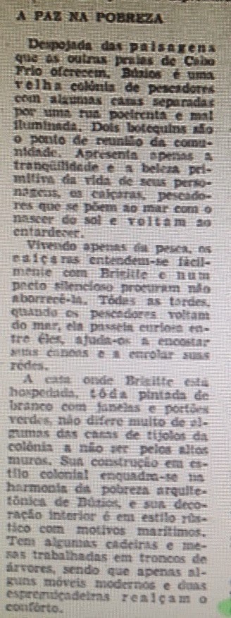 Anos 1960: o terreno que lhe foi doado, localizado na praia da Armação, escolhido por ela, estava avaliado em 2 milhões de cruzeiros. Brigitte disse que o Prefeito Antonio de Macedo Costa foi um "bom papai Noel". Na ocasião, Brigitte Bardot prometeu construir imediatamente uma luxuosa casa de praia.Interessante a descrição da Búzios de então feita pelo repórter: