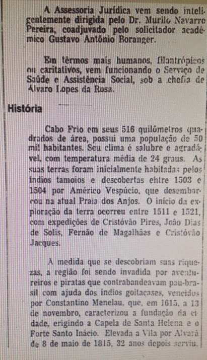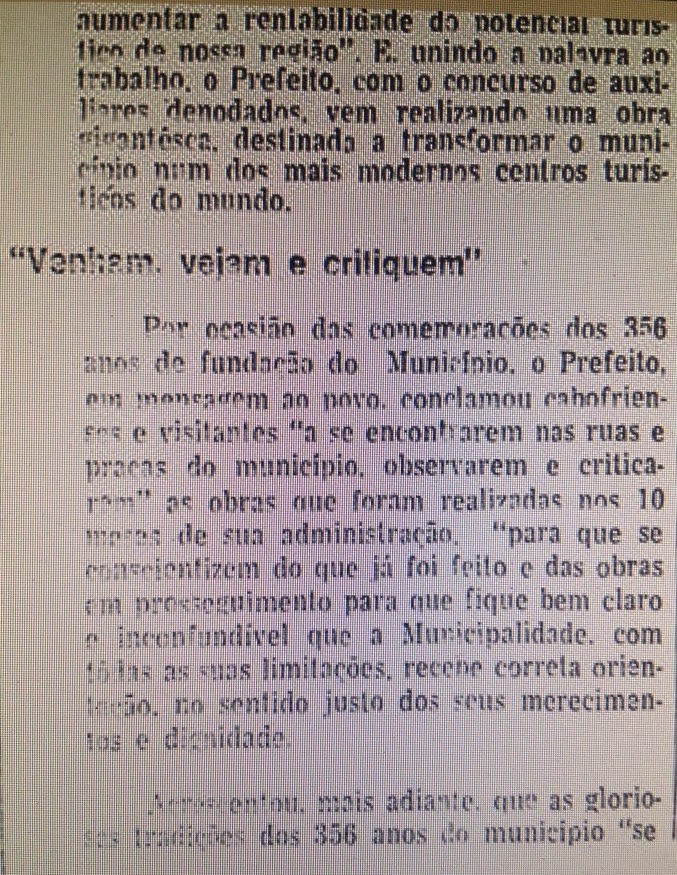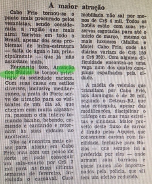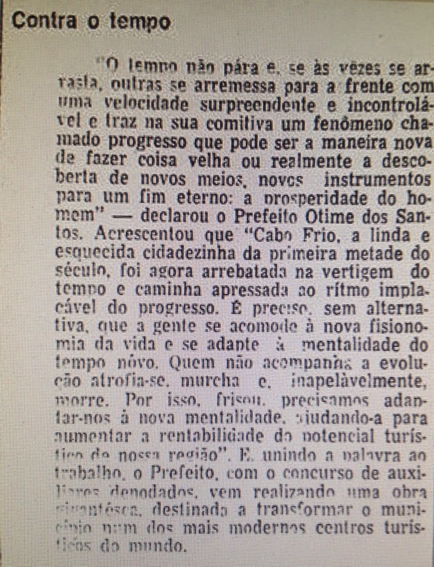 Anos 1960: a repercussão da estada de Brigitte em Búzios e a questão do terreno. A partir da visita de Brigitte Bardot a Búzios a cidade de Cabo Frio adquiriu projeção internacional. Novo Prefeito eleito em 15/11/1970, Otime Cardoso dos Santos, reconhece que o município "não está preparado para receber o fluxo surpreendente de visitantes".