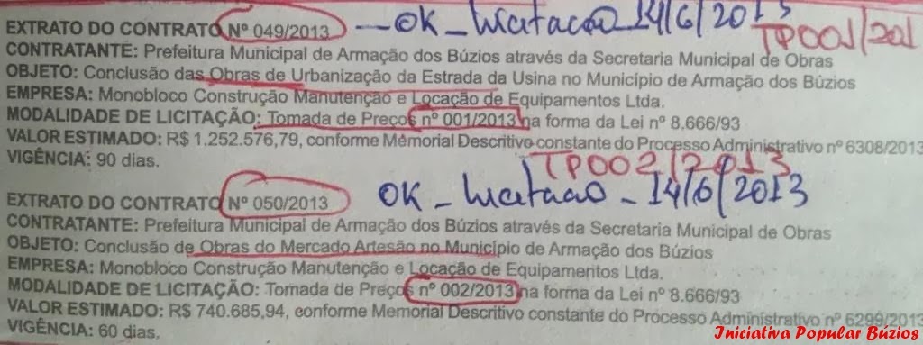 A empresa "Monobloco" ganha os dois contratos: 49/2013 e 50/2013, oriundos das TPs 001/2013 e TP 002/2013.