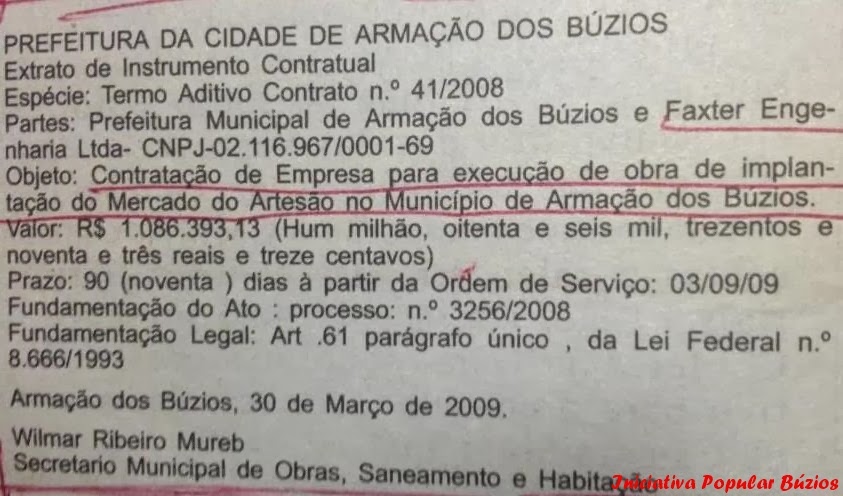 Governo Mirinho Braga publica termo aditivo ao contrato nº 41/2008. Como o contrato é /2008 a licitação deve ter ocorrido durante o governo Toninho entre os dias 7/4/2008 (data do adiamento sine die) e 31/12/2008 (final de governo). Reparem que o processo administrativo 3256/2008 também é de 2008. O Extrato não é claro mas o que deve ter sido aditivado foi o prazo para o término das obras. A Faxter Engenharia Ltda ganhou mais 90 dias a partir da data do extrato (30/03/09). Ou seja, teria que entregar a obra em Junho de 2009. Registre-se também que o valor da obra dá um salto: de R$ 332.147,58 para R$ 1.086.393,13.
