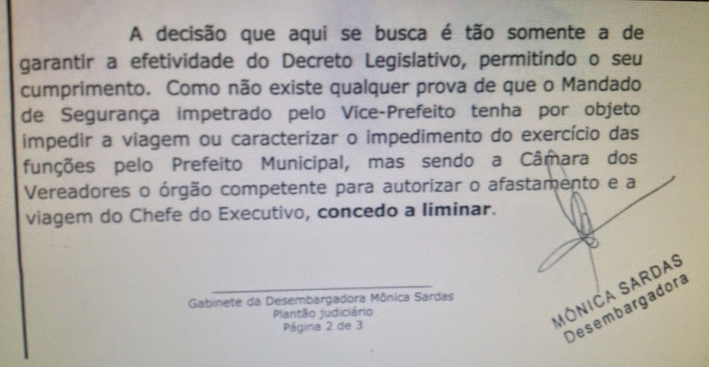 E a decisão da Desembargadora do Plantão Judiciário Mônica Sardas: