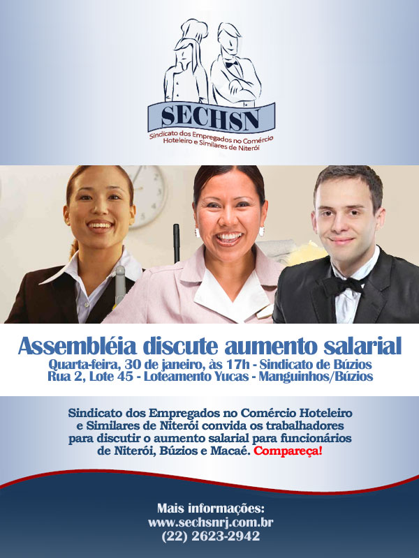 "Ministério do Trabalho e Emprego", Armação dos Búzios tinha, em 31/12/2011, 10.612 (6.024 homens e 4.589 mulheres) trabalhadores com carteira assinada. Destes, 5.488 são trabalhadores do setor "Serviços" e 2.198 do "Comércio". Somando os dois setores, temos mais de 7.500 trabalhadores de Búzios que serão atingidos pelas decisões tomadas na Assembleia. É por isso que é importante que todos os profissionais dos dois setores participem da Assembleia.
