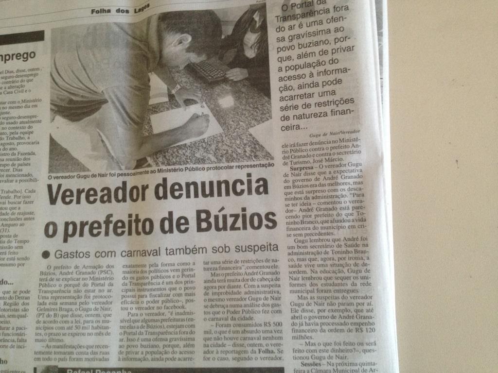 Vereador Gugu de Nair esteve no MP de Cabo Frio onde protocolou representação contra o Prefeito de Búzios André Granado pela não criação do Portal da Transparência, apesar de existir Lei que o obrigava a fazê-lo até o mês de maio último. Parabéns vereador. Raríssimas vezes um Prefeito de Búzios foi alvo de denúncia ao MP. O Legislativo existe para isso. Não esquecer que o Legislativo também é um Poder Público e como tal, da mesma forma que o Executivo, é abrangido pela Lei. O senhor poderia muito bem entrar com uma representação contra o Presidente da Câmara Leandro Pereira dos Santos por não criar também o Portal da Transparência do Legislativo. Que tal? Assim seria mantida a coerência. Não?